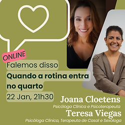 📍 22 de Janeiro, 5ª feira, às 21h30 | ONLINE no Instagram Com Joana Cloetens & Teresa Viegas, da Clínica da AutoEstima A rotina não se anuncia. Aparece nos dias cheios, no cansaço acumulado... e, quando dás por ela, o quarto também mudou de ritmo. Nesta conversa online com a Drª Teresa Viegas e a Drª Joana Cloetens, convidamos-te a olhar com honestidade para o que acontece ao desejo ao longo do tempo: quando a vida pesa, quando a autoestima oscila e quando a intimidade já não é (tão) espontânea como antes. Falamos de relações reais, sem idealizações. De como o desejo se transforma, de como a presença se perde... e pode voltar! Não teremos receitas prontas, mas traremos consciência, novas perguntas e algumas estratégias para o "reacender da chama". Uma conversa para quem quer compreender melhor a sua relação, cuidar do vínculo e redescobrir o prazer de estar consigo e com o outro. ___ Convidadas: ✨Drª Joana Cloetens (Psicóloga Clínica e Psicoterapeuta) Com formação em Psicologia Clínica e da Saúde, abraça o desenvolvimento humano em todas as suas fases. Especialista em Sexualidade e Conjugalidade, acredita na escuta ativa e no poder de crescer, mais do que mudar. ✨Drª Teresa Viegas (Psicóloga Clínica, Terapeuta de Casal e Sexóloga) Foca-se nas relações, a começar pela que temos connosco. Acompanha processos de reconexão interior e acredita numa sexualidade consciente, livre e integrada como parte essencial de uma vida com sentido. ✨Clínica da AutoEstima Um espaço de escuta, cuidado e reencontro consigo mesmo. O seu propósito nasce na interseção entre autoestima, sexologia e terapia de casal, ajudando cada pessoa a viver-se de forma mais alinhada com o que sente e deseja. ____ Para quem é: Esta conversa é para ti se sentes que a rotina entrou no quarto sem pedir licença. Se amas, mas às vezes sentes distância. Se queres cuidar da tua relação sem fórmulas mágicas, sem culpas e sem fingir que está tudo bem. ___ 📍 22 de Janeiro, 5ª feira, às 21h30 | ONLINE no Instagram /the.joyspot Duração: 60 minutos