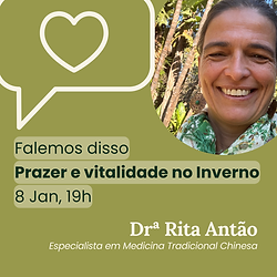 📍8 de Janeiro, 5ª feira, às 19h00 Falemos disso, um espaço de aprendizagem e partilha. ----- Um encontro com Drª Rita Antão sobre o que o teu corpo pede nesta estação O inverno convida a abrandar. A escutar com mais atenção. A cuidar do que é essencial, dentro de ti. Nesta conversa vamos explorar como o inverno influencia o corpo, a energia vital, o prazer e o equilíbrio emocional, à luz da medicina chinesa e de uma escuta mais consciente do corpo feminino. Falaremos sobre: - porque esta estação pede mais nutrição, recolhimento e cuidado; - a relação do inverno com os rins, o sistema reprodutor e a energia vital; - como este tempo de pausa prepara o corpo (e a ment) para florescer na primavera; - de que forma cuidar de ti agora impacta a clareza, o foco, o prazer e a capacidade de sonhar e criar. Tal como a natureza repousa antes de voltar a crescer, o corpo também precisa deste tempo para se fortalecer por dentro. Nutrir agora é permitir que, mais à frente, haja expansão, movimento e vitalidade. ___ Convidada: ✨ Drª Rita Antão Licenciada em química industrial com especialidade de investigação de laboratório e Especialista em Medicina Tradicional Chinesa desde 2011, com vasta experiência clínica, formativa e investigativa. Fundadora e gestora da clínica Sana Maresia, dedicada às terapias integrativas, desde 2018. Carreira consolidada como terapeuta, naturopata e professora em instituições de referência. Competências transversais em fitoterapia, dietética, botânica e práticas complementares de saúde. -------- 👉 Reserva o teu lugar. 📍 8 de Janeiro, 5ª feira, às 19h00 Inscrição obrigatória | Doação consciente (5€ sugeridos) Duração: 45 minutos | Chá disponível no local